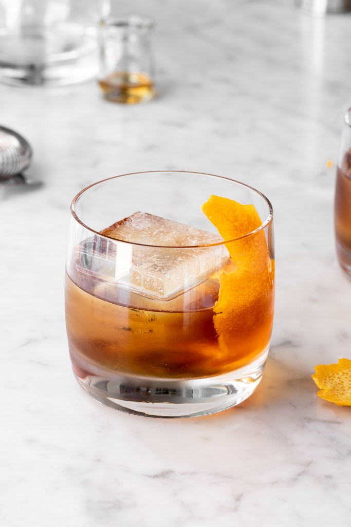 - Garnish with a twist of orange peel.